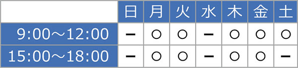 | 診療時間 | 【診療時間】![]() 【受付時間】 午前=11:30まで 午後=17:30まで 【休診】 日曜日・祝祭日・水曜日・土曜日午後 |